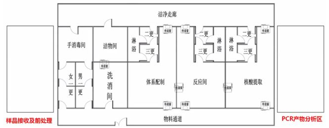 雙走廊四/三區(qū):雙走廊即潔凈走廊和物料通道(普通走廊、污染走廊)。四/三區(qū)主要指中間的功能區(qū),做熒光定量PCR只需三區(qū)足以(體系配制、核酸提取、反應間),若是普通PCR/RTPCR,必須有PCR產(chǎn)物分析區(qū)(建議獨立在三區(qū)之外)。