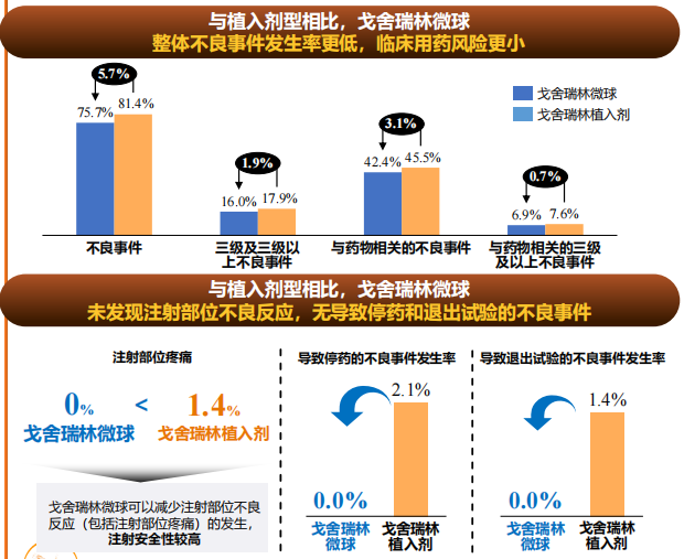 作為全球首個(gè)且唯一獲批的戈舍瑞林微球產(chǎn)品,百拓維從關(guān)鍵輔料到制劑均為我國自主研發(fā),且采用了二代乳化溶劑揮發(fā)法更新工藝,實(shí)現(xiàn)了高達(dá)90%以上的藥物包封率和批次間高穩(wěn)定性,并改善藥物的釋放效果。該產(chǎn)品打破了20多年來進(jìn)口戈舍瑞林植入劑的壟斷地位,而且沒有單純仿制早先上市、不夠先進(jìn)的微球制劑,而是選擇走劑型改良的開發(fā)策略。目前注射用戈舍瑞林微球用于前列腺癌的臨床III期研究論文已公布,從研究結(jié)果來看,注射用戈舍瑞林微球的去勢成功率與戈舍瑞林植入劑相當(dāng):該研究采用非劣效性設(shè)計(jì),治療29天時(shí)(起始治療后的第2次注射)兩組去勢患者比例分別為99.3%和100%,維持至第85天時(shí)(起始治療后第3次注射)的比例則分別為99.3%和97.8%,注射用戈舍瑞林微球療效達(dá)到非劣于戈舍瑞林植入劑的標(biāo)準(zhǔn)。在主要終點(diǎn)及其它次要終點(diǎn)表現(xiàn)相當(dāng)?shù)那闆r下,注射用戈舍瑞林微球組患者注射部位不良反應(yīng)(如疼痛、紅腫等)發(fā)生率顯著低于戈舍瑞林植入劑組(0 vs. 1.4%),證實(shí)了其改善患者治療體驗(yàn)的價(jià)值,畢竟傳統(tǒng)植入劑注射針頭有1.6毫米粗,而注射用戈舍瑞林微球針頭外徑僅為0.8毫米,改善顯而易見;此外,研究中也未發(fā)現(xiàn)與注射用戈舍瑞林微球治療相關(guān)、并導(dǎo)致停藥和退出研究的不良事件[7]。復(fù)旦大學(xué)附屬腫瘤醫(yī)院副院長、泌尿腫瘤 MDT 首席專家葉定偉教授指出,注射用戈舍瑞林微球在臨床療效和安全性與植入劑型一致,注射方式、患者體驗(yàn)更佳,為前列腺癌臨床治療提供了更多選擇。